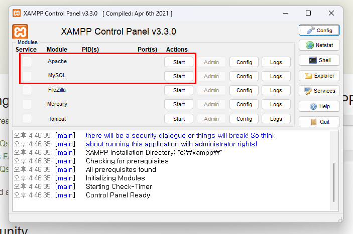 - Apache와 MySQL 옆에 있는 Start 버튼 클릭